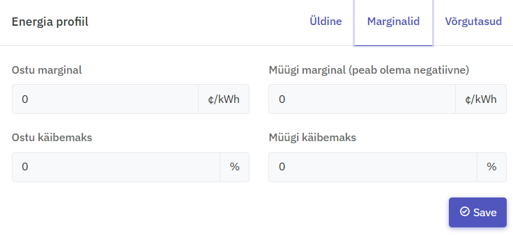 • Kui saad taastuvenergiatoetust 5 senti/kWh (jaam rajatud enne 2020. aasta lõppu), sisesta väärtuseks 0, sest uued tasud koos marginaaliga on väiksemad, kui toetus.