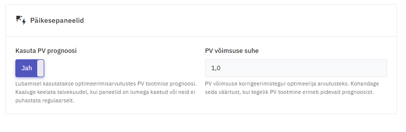 Kui Kasuta PV prognoosi on sisse lülitatud, kasutab Optimizer päikeseenergia tootmise prognoosi oma otsuste tegemisel.
